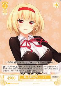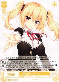 レベル3以上のキャラクターへパワー+2000できる応援テキスト持ちのキャラクターです。起動効果として相手の控え室が5枚以下であれば、相手の山札の上から5枚を控え室に送るテキストを行使できるので<1000年ぶりの再会 パトリシア&ノラ>の逆圧縮テキストやレベル2でも状況に応じて使用できる点から重宝されると考え採用いたしました。