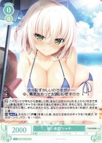 早出しキャラクターです。登場時に控え室からキャラクターカードを手札に加え、起動効果を使った時にバトル相手がリバースしたら、山札の上から1枚をストック置くことができるためストック補給と手札補充を担えるキャラクターとなります。青の採用を絞っているため今回は採用を断念しましたが採用する価値のあるカードだと感じました。眩い柔肌 シャチ