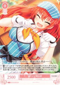 登場時山札サーチ+舞台から控え室へ置かれたときに控えサーチできるキャラクターです。レベル1のキャラクターカードは<天真爛漫なバイトギャル 明日原>のみのため4枚採用したいところですが、入れたい・試したいカードの都合上3枚の採用でスタートしました。