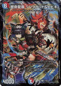 出た時に山札の上を1枚見て手札かタップしてマナゾーンに置くことができる「ドラグハート・ウエポン」です。特にマナゾーンに置くことができる点は評価が高く、相手から早期に攻撃された時に<響命龍覇 リンクウッド&ヒビキ>などを踏んで<熱血剣 レジェンドホーン>を装備することでマナを伸ばすことで相手の速度に追いつくことができたりします。