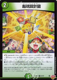 - 自分のマナゾーンに光、火、自然の各文明があれば、このカードに「D・D・D[cc08]」を与え、そのコストを攻撃中のクリーチャーのコストの数少なくする。ただし、コストは0以下にはならない。