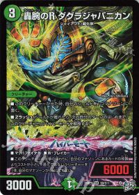 - このクリーチャーが出た時または攻撃する時、自分の他のクリーチャーを1体破壊してもよい。そうしたら、カードを1枚引き、相手のクリーチャーを1体選び、破壊する。