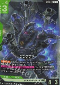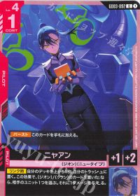 - 【リンク時】自分のデッキを上から1枚、自分のトラッシュに置く。この効果で、〔ジオン〕/〔クラン〕のカードを置いたなら、相手のユニット1つを選ぶ。それに1ダメージを与える。