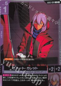 - 【セット時・〔Xラウンダー〕のパイロット】自分のトラッシュの〔ヴェイガン〕のカード4枚を選んでもよい。それらをゲームから除外する。そうしたなら、Lv.4以下の相手のユニット1つを選ぶ。それを破壊する。