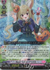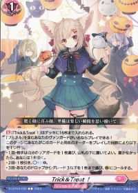 これにより、ドロップにあるTrick&Treat!1枚につき前列のユニットのパワーを+2000し、さらにヴァンガード1枚とリアガード1枚を選択してクリティカル+1します。