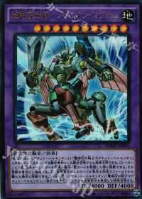 <磁石の戦士Σ+><磁石の戦士Σ->は、アニメ『遊戯王GX』の三沢が使用していた「マグネット・ウォリアー」です。<磁石の戦士Σ->が「融合」カードを介さなくても手札融合を可能にしてくれるので、<磁石の戦士Σ+>が手札かフィールドに揃っていれば、<超電導戦騎プラズマ・マグナム>の融合召喚につなげられます。