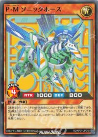 相手フィールドに表側表示モンスターが居る事と、自分の墓地がある程度肥えている事が前提にはなりますが、相手フィールドのモンスター1体を裏側守備表示にしつつ、墓地の<P・M プレイ>を自分フィールドにセットできる効果は非常に優秀です!<P・M ソニックホース>同様に中盤以降で真価を発揮するカードではありますが、強力なカードなのでこちらも3枚採用!