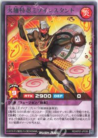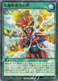 <火麺忍者ストレー>と<万能調味査察官>のフュージョン!墓地の炎族3体をデッキに戻して、直接攻撃可能+攻撃表示モンスターを裏側守備表示にする効果を持っています!